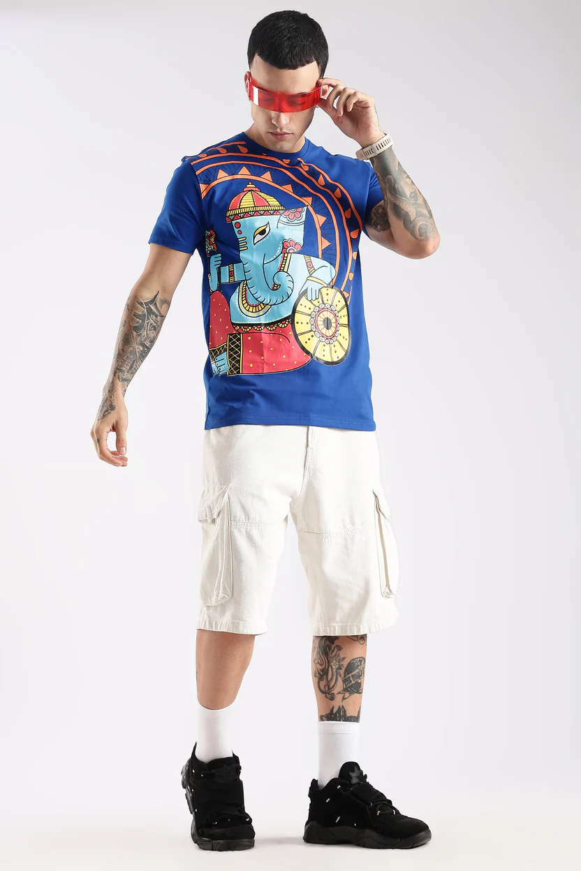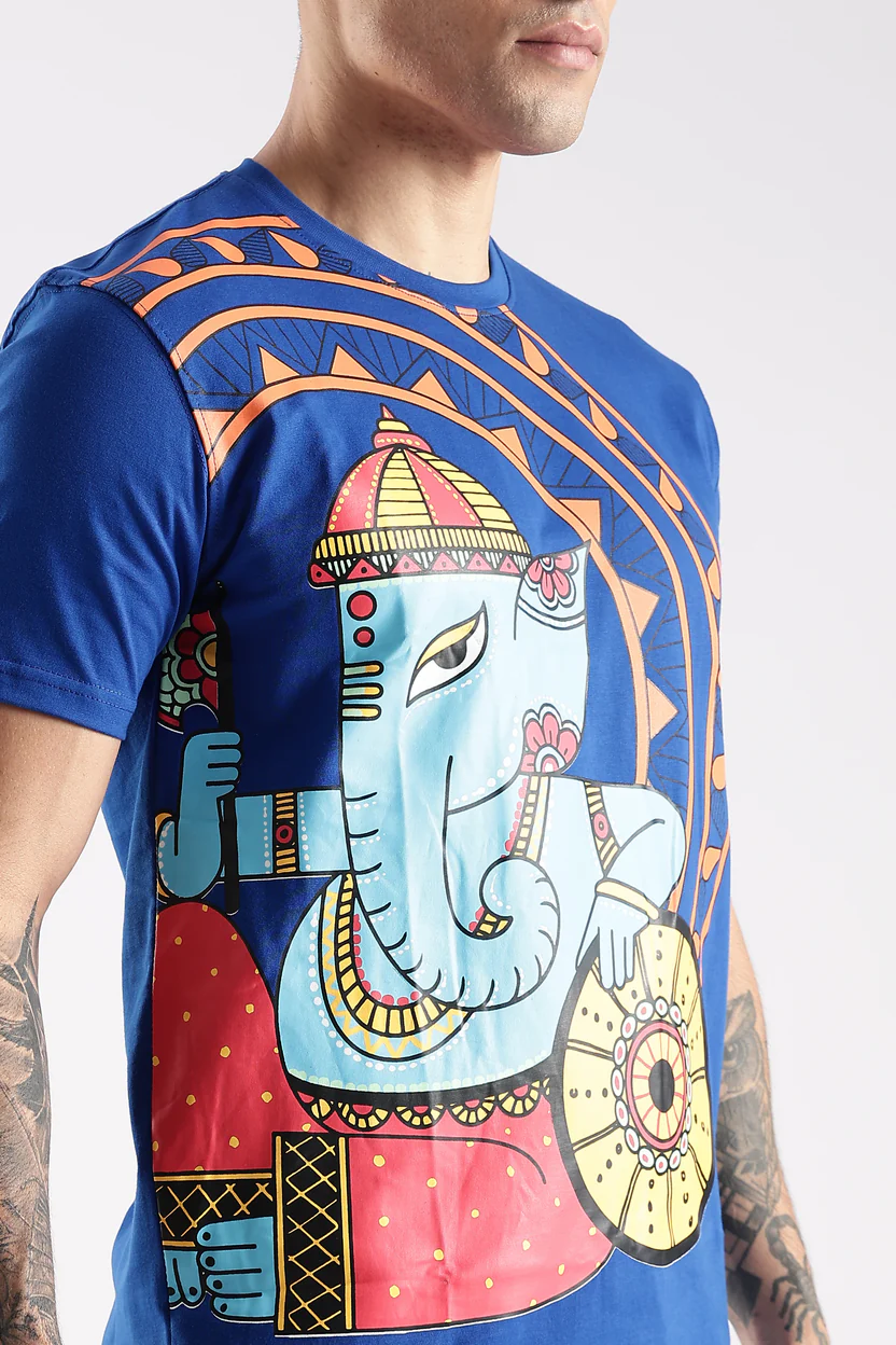 Invoke the blessings of Shree Ganesh, the remover of obstacles and the harbinger of good fortune, with this vibrant artistic T-shirt. The royal illustration showcases Ganpati Bappa in a traditional yet modern folk-art style, symbolizing wisdom, prosperity, and new beginnings.
