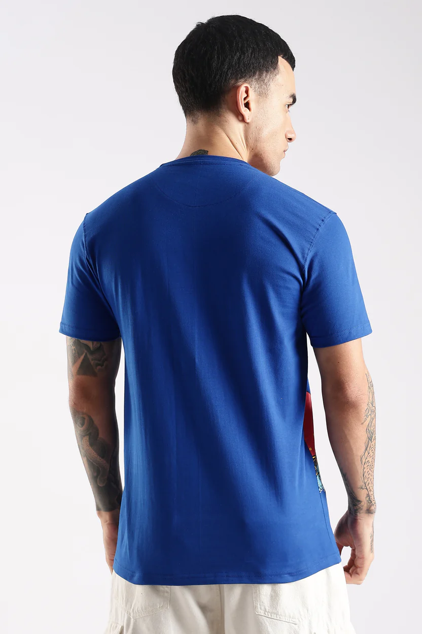 The rich blue (Neel Raj) base enhances the colorful detailing, giving it a bold and festive appeal. Designed with premium breathable fabric, this T-shirt offers both comfort and standout style for everyday wear.
